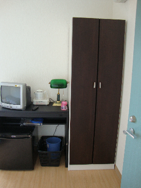 - 部屋には、ベッド・テレビ・冷蔵庫・クーラー・テーブル・洋服掛け 長期利用の方向きのクローゼット付部屋もあります